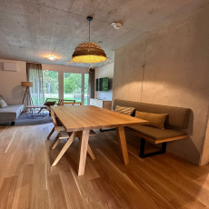 Das Herzstück der Wohnung bildet der großzügige Wohn-, Koch- und Essbereich mit Zugang zum Balkon – der perfekte Ort, um die Ruhe und Schönheit der Umgebung zu genießen.