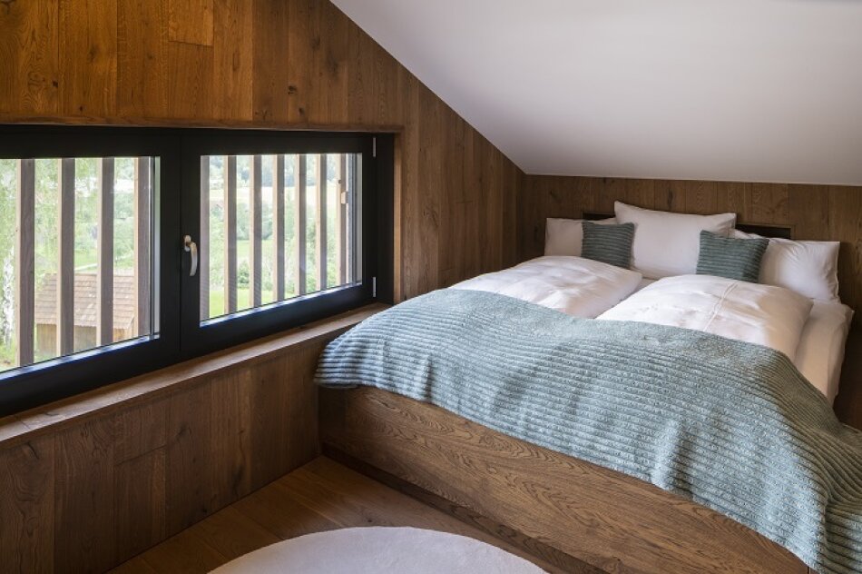 Zwei getrennt begehbare Schlafzimmer – Master-Bedroom mit Bad und Blick ins Grüne, freistehender Badewanne, bodenebener Dusche und WC