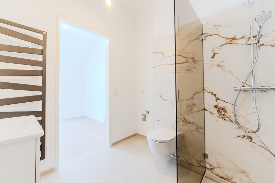 Vorraum, Bad mit Dusche, WC & Waschmaschinenanschluss, 2 getrennt begehbare Zimmer, Wohn/Koch/Essbereich mit Zugang zur Loggia, Gäste-WC mit Handwaschbecken und ein weiteres Badezimmer mit Doppelwaschbecken und Walk-in-Dusche.