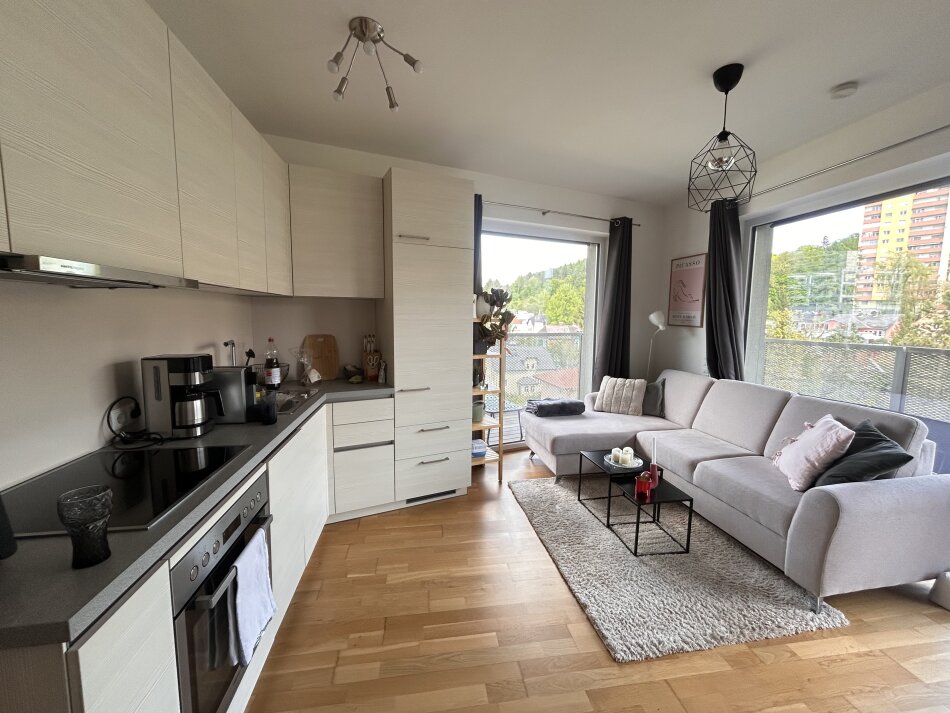Der helle, großzügige Wohn-Essbereich ist mit einer modernen, voll ausgestatteten Küche ausgestattet und bietet einen herrlichen Grünblick – eine ideale Verbindung von Wohnkomfort und Lebensqualität.