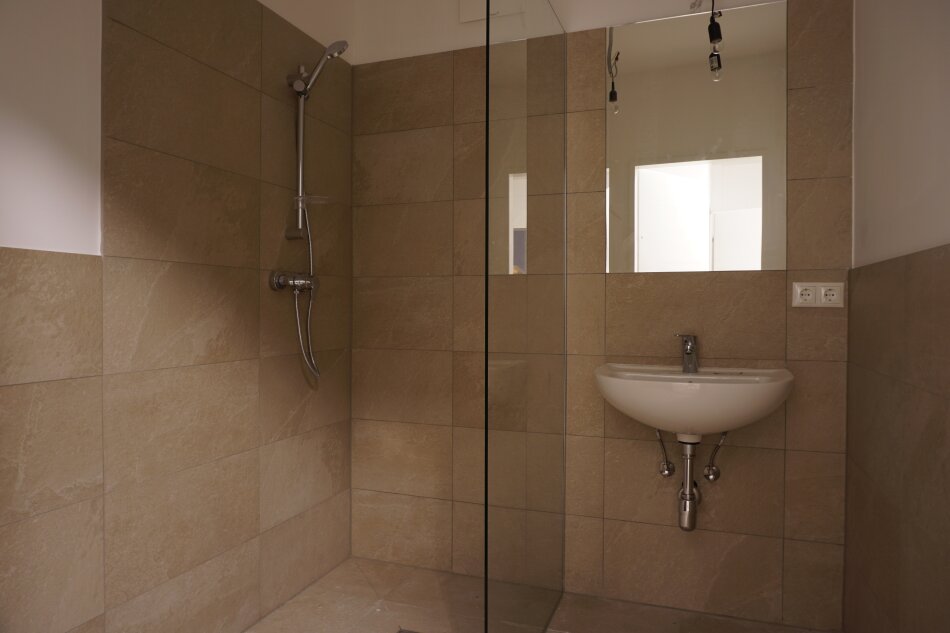 Badezimmer mit Dusche und Waschmaschinenanschluss