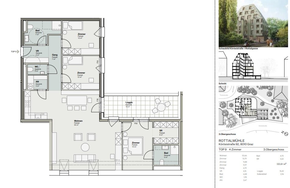 Das besondere Augenmerk der Planung liegt auf cleveren und funktionalen Grundrissen: Jede Wohnung punktet mit offenen, hellen Wohn-Ess-Bereichen, ruhigen Schlafzimmern, praktischen Abstellräumen und privaten Freiflächen wie Balkon, Loggia oder Terrasse. Großzügige Verglasungen holen viel Tageslicht in die Innenräume und schaffen eine freundliche Atmosphäre. Die Raumaufteilung garantiert optimale Lichtverhältnisse und sorgt für eine klare Trennung von Wohn- und Ruhezonen. Für höchsten Komfort sorgt eine moderne Ausstattung mit barrierefreiem Lift, einer hauseigenen Tiefgarage, sowie Einlagerungsräume für jede Einheit. Ein Fahrradraum und umweltfreundliche Haustechnik runden das Bild ab – beides ein Plus für nachhaltige Lebensqualität. Die Rottalmühle steht so für urbanes Leben in einem der schönsten Bezirke von Graz– mit durchdachter Architektur, Komfort, hoher Wohnqualität und intelligenten Grundrissen für die Anforderungen von morgen. So fühlt sich Leben in Geidorf an!
