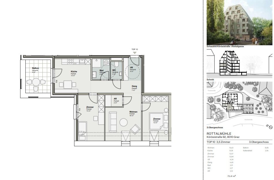 Das besondere Augenmerk der Planung liegt auf cleveren und funktionalen Grundrissen: Jede Wohnung punktet mit offenen, hellen Wohn-Ess-Bereichen, ruhigen Schlafzimmern, praktischen Abstellräumen und privaten Freiflächen wie Balkon, Loggia oder Terrasse. Großzügige Verglasungen holen viel Tageslicht in die Innenräume und schaffen eine freundliche Atmosphäre. Die Raumaufteilung garantiert optimale Lichtverhältnisse und sorgt für eine klare Trennung von Wohn- und Ruhezonen. Für höchsten Komfort sorgt eine moderne Ausstattung mit barrierefreiem Lift, einer hauseigenen Tiefgarage, sowie Einlagerungsräume für jede Einheit. Ein Fahrradraum und umweltfreundliche Haustechnik runden das Bild ab – beides ein Plus für nachhaltige Lebensqualität. Die Rottalmühle steht so für urbanes Leben in einem der schönsten Bezirke von Graz– mit durchdachter Architektur, Komfort, hoher Wohnqualität und intelligenten Grundrissen für die Anforderungen von morgen. So fühlt sich Leben in Geidorf an!