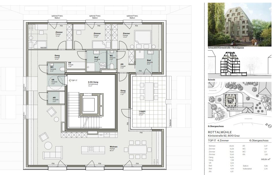 Das besondere Augenmerk der Planung liegt auf cleveren und funktionalen Grundrissen: Jede Wohnung punktet mit offenen, hellen Wohn-Ess-Bereichen, ruhigen Schlafzimmern, praktischen Abstellräumen und privaten Freiflächen wie Balkon, Loggia oder Terrasse. Großzügige Verglasungen holen viel Tageslicht in die Innenräume und schaffen eine freundliche Atmosphäre. Die Raumaufteilung garantiert optimale Lichtverhältnisse und sorgt für eine klare Trennung von Wohn- und Ruhezonen. Für höchsten Komfort sorgt eine moderne Ausstattung mit barrierefreiem Lift, einer hauseigenen Tiefgarage, sowie Einlagerungsräume für jede Einheit. Ein Fahrradraum und umweltfreundliche Haustechnik runden das Bild ab – beides ein Plus für nachhaltige Lebensqualität. Die Rottalmühle steht so für urbanes Leben in einem der schönsten Bezirke von Graz– mit durchdachter Architektur, Komfort, hoher Wohnqualität und intelligenten Grundrissen für die Anforderungen von morgen. So fühlt sich Leben in Geidorf an!