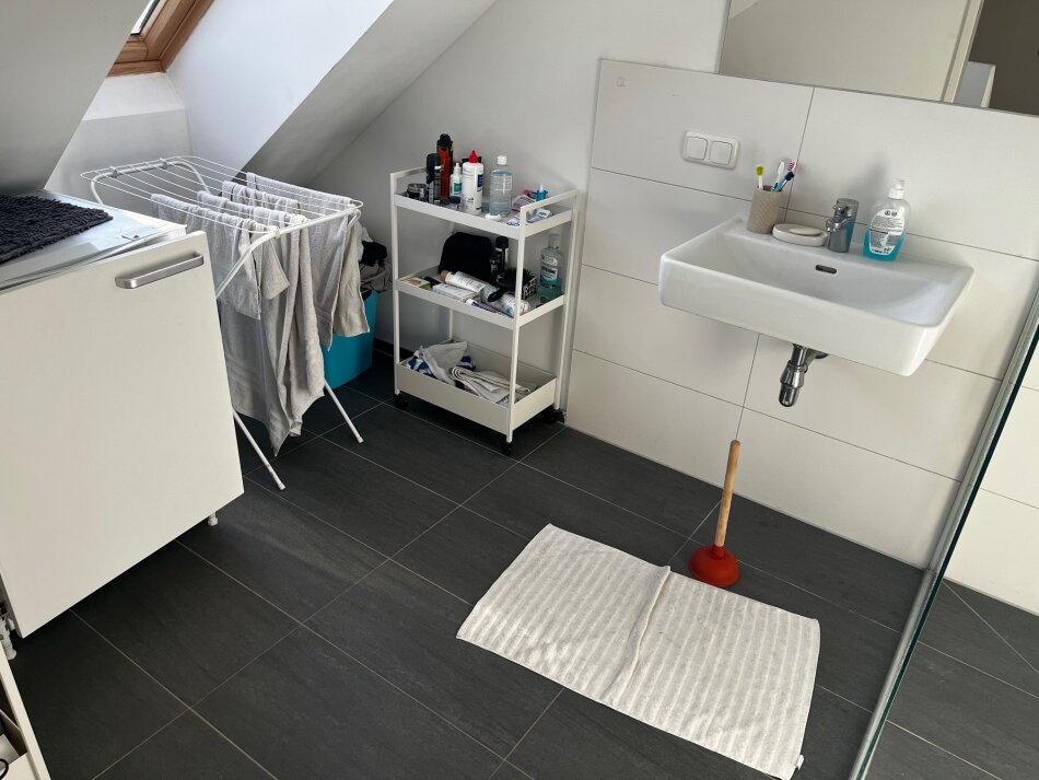 Das Obergeschoss bildet das Herzstück der Wohnung: Ein heller, offener Wohn- und Essbereich mit integrierter Küche schafft eine angenehme Wohnatmosphäre und bietet direkten Zugang zur sonnigen Terrasse. Ergänzt wird diese Ebene durch ein Badezimmer mit Dusche, Fenster und Waschmaschinenanschluss sowie mit einem weiteren Zimmer.